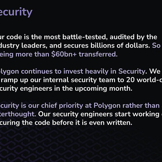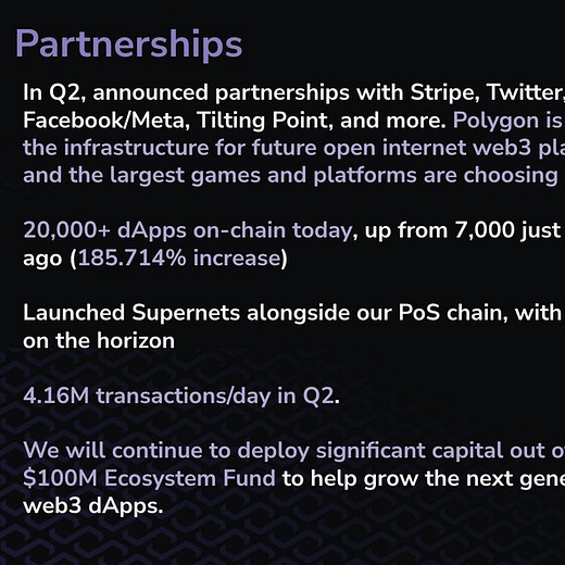 As you can see from Ryanâs slides, the Polygon team is doubling down on their initial thesis and sure seem to have the treasury, partnerships and momentum to keep things moving in the right direction. Only time will tell, but it definitely seems the future is bright for Polygon, especially compared to some other high-profile projects we have recently seen fall from grace due to mismanagement, bridge drains, stablecoin depegs and a host of other interesting reasons - each worthy of future zachxbt investigations or spots on the legendary rekt leaderboard.